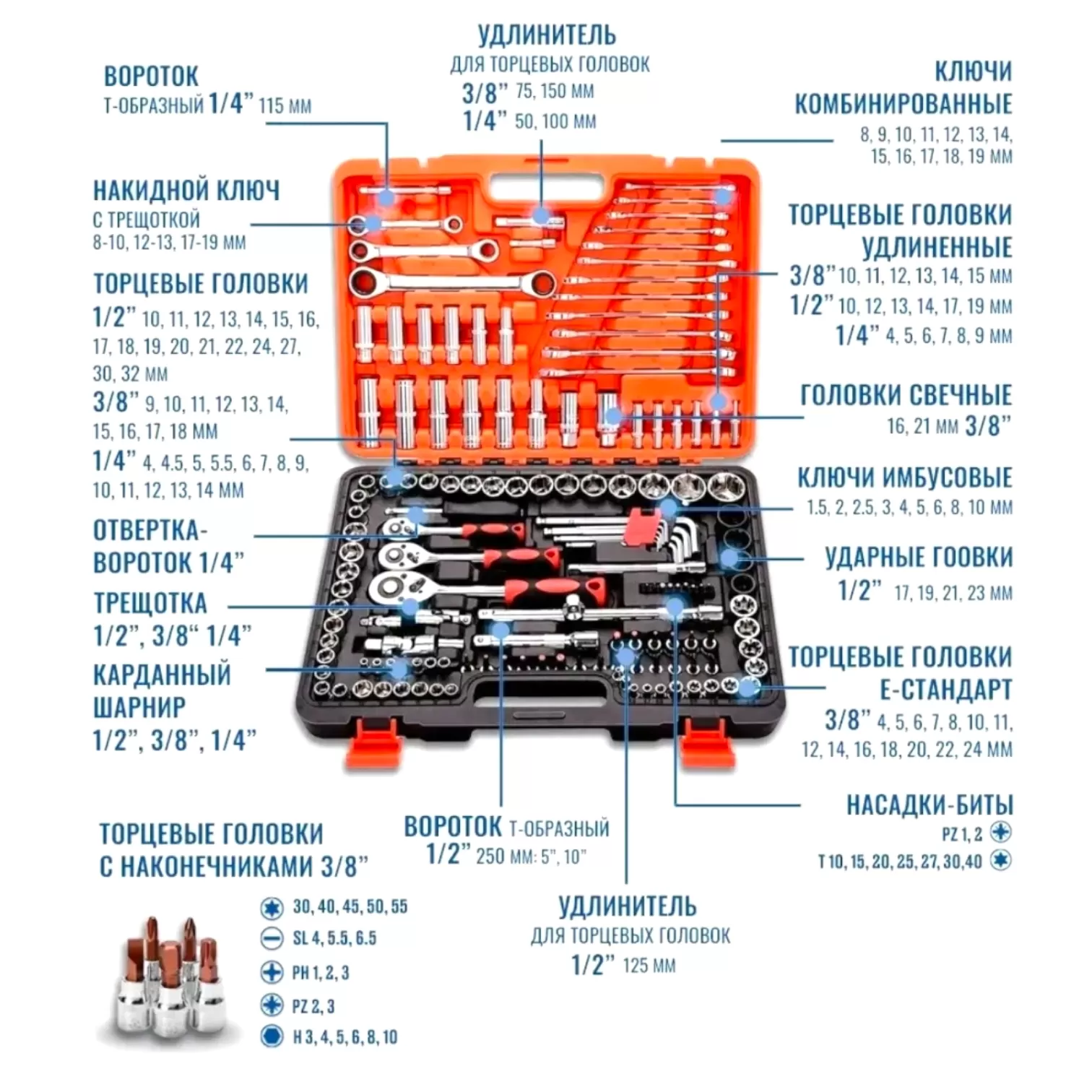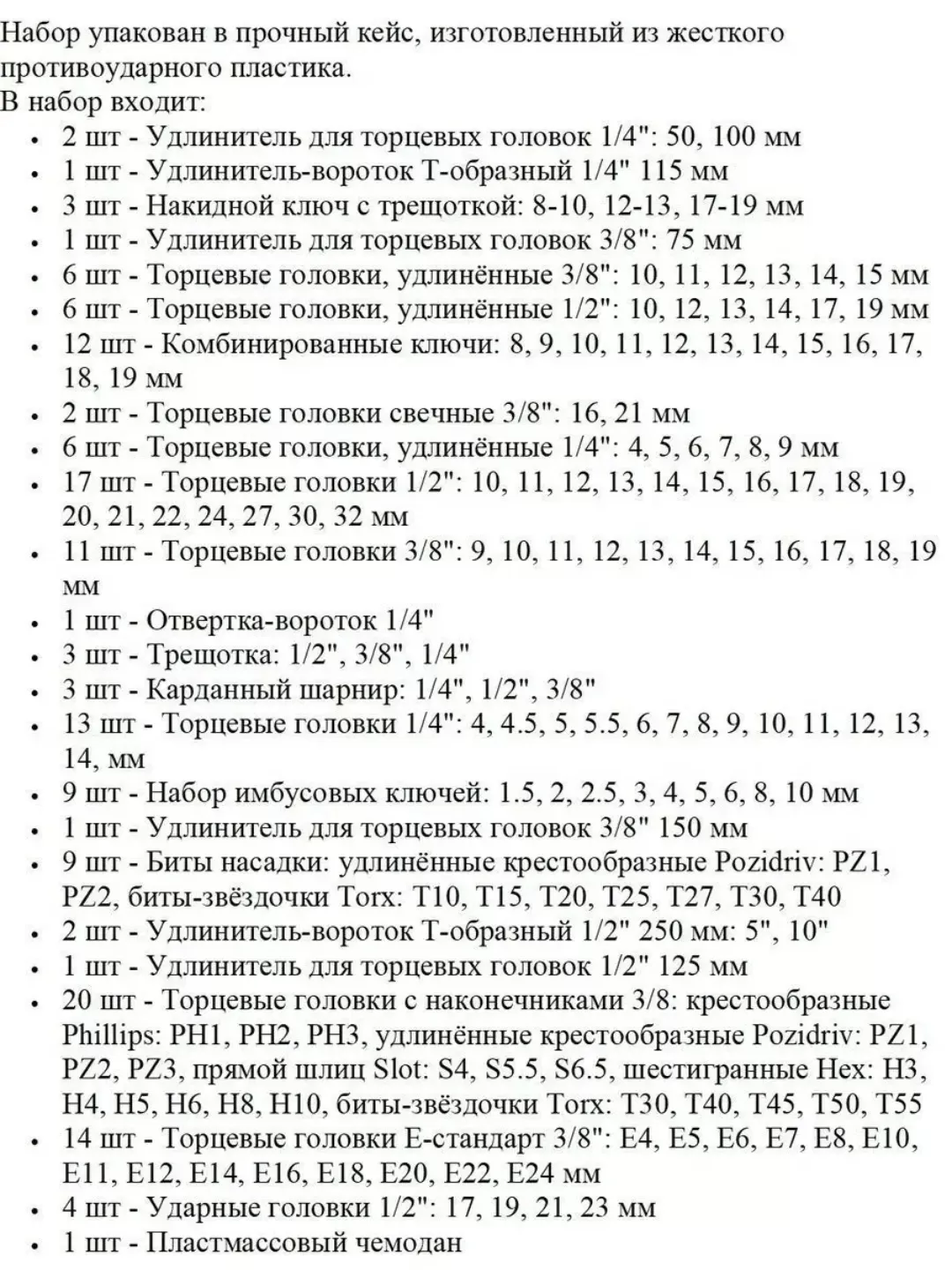 Набор инструментов автомобильный 150 предметов создан для профессионального использования в автосервисах. Рабочая часть всех элементов изготавливается из высокопрочной CRV стали, которая отличается устойчивостью к перепадам температур, влаге и механическим воздействиям. Рукоятки трещоток, воротка выполнены из двухкомпонентного материала высокой плотности, имеющего приятную бархатистую поверхность на ощупь. Все элементы имеют специальную маркировку с размерами. Набор упакован в прочный кейс, изготовленный из жесткого противоударного пластика и имеет надежные застежки.
