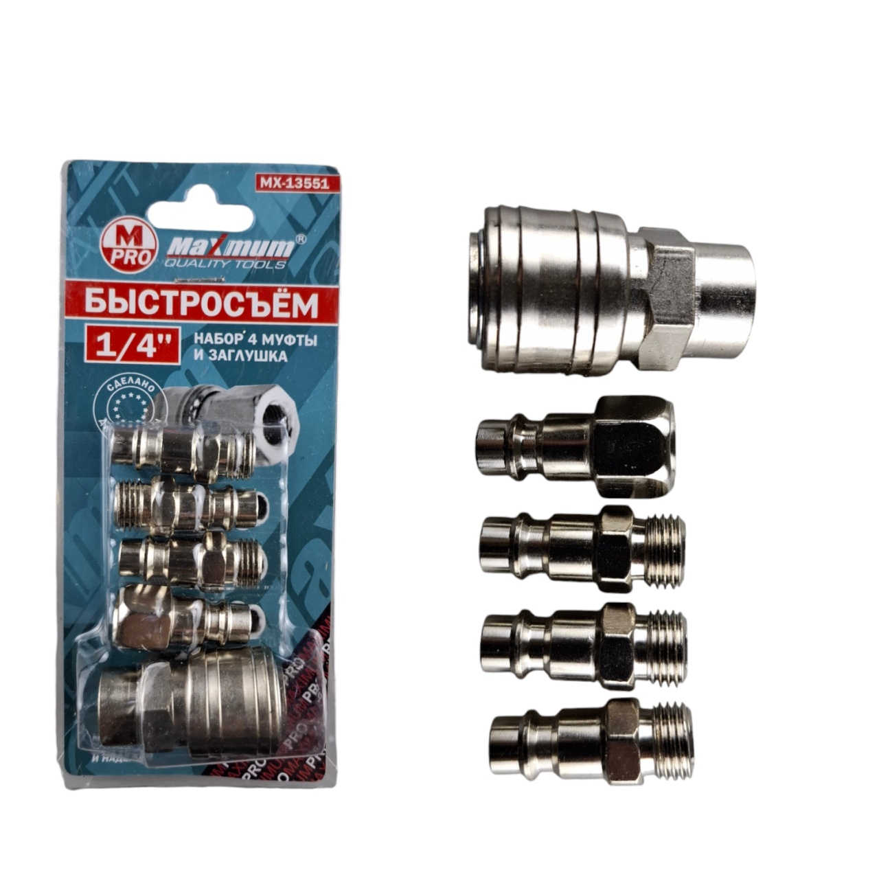 Набор быстроразъемных соединений для пневматических линий от "Maximum Quality Tools" выполнен из нержавеющей стали. Набор включает: