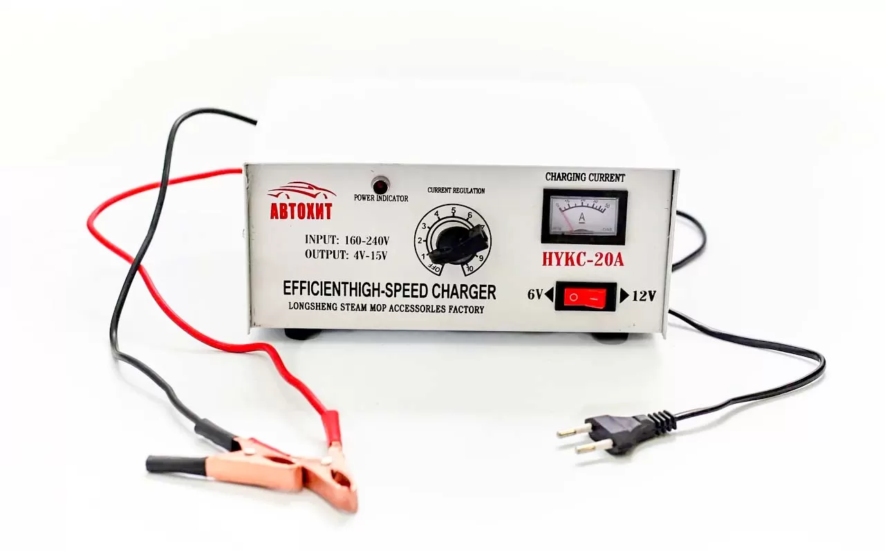 Зарядно-предпусковое устройство для автомобильного аккумулятора АвтоХит 20 А предназначено для зарядки свинцово-кислотных аккумуляторов напряжением 6,12 В. На передней панели устройства расположены ступенчатый регулятор интенсивности заряда, амперметр, вольтметр и переключатель напряжения. На задней панели расположен предохранитель.