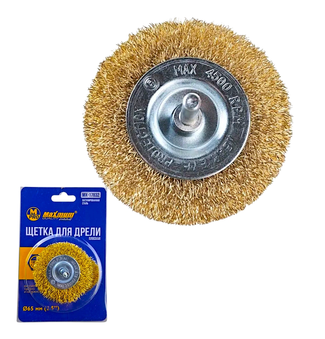 Щетка плоская с проволочной латунированной щетиной 65 мм от "MAXIMUM QUALITY TOOLS" крепится на дрель или шуруповерт через резьбовую шпильку 6 мм.